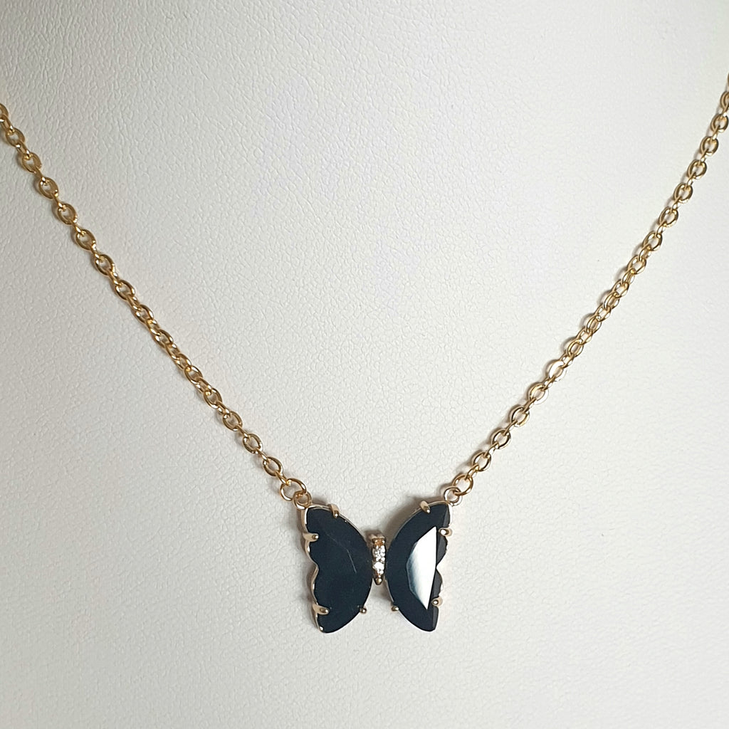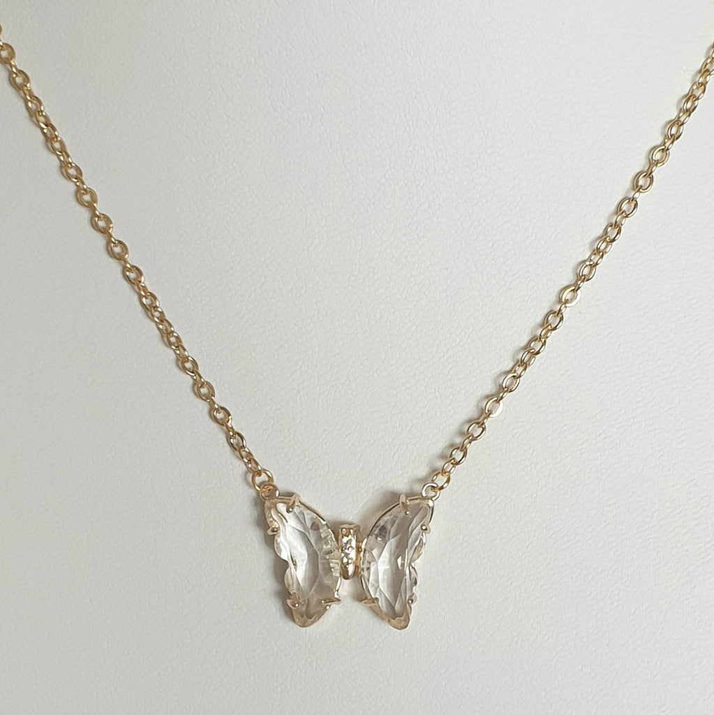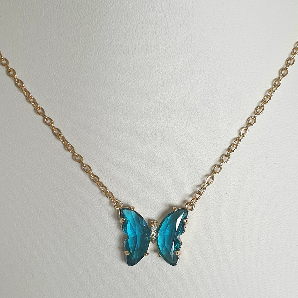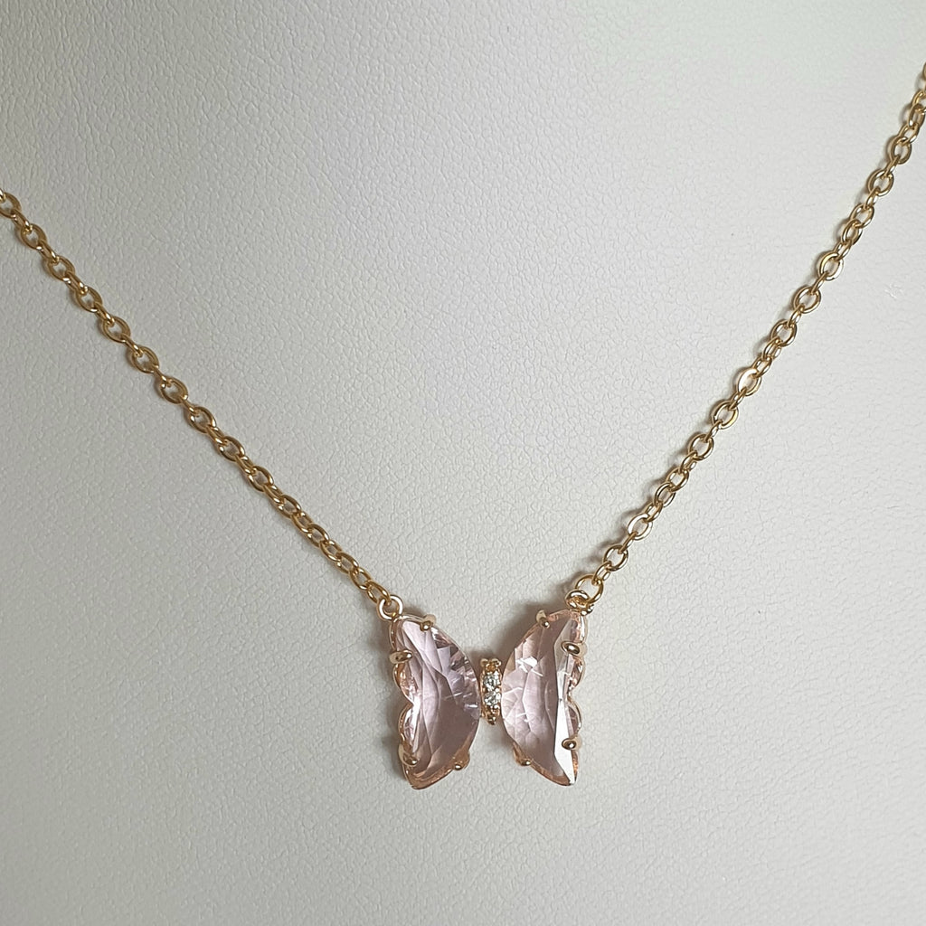 Chaîne en acier inoxydable de couleur or avec un pendentif papillon en cristal. Différentes couleurs au choix.