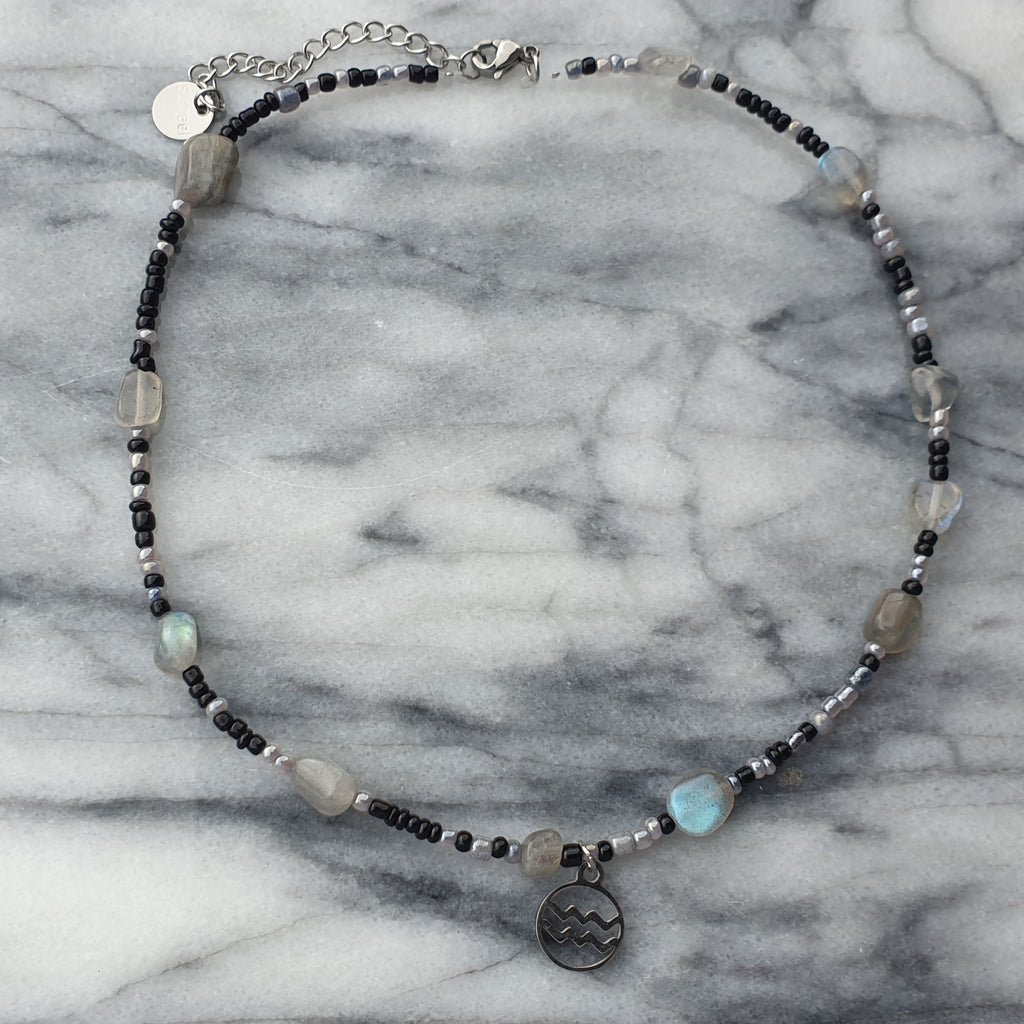 Collier personnalisé en spectrolite naturelle et perles de verre grises et noires. Chaque collier est unique !