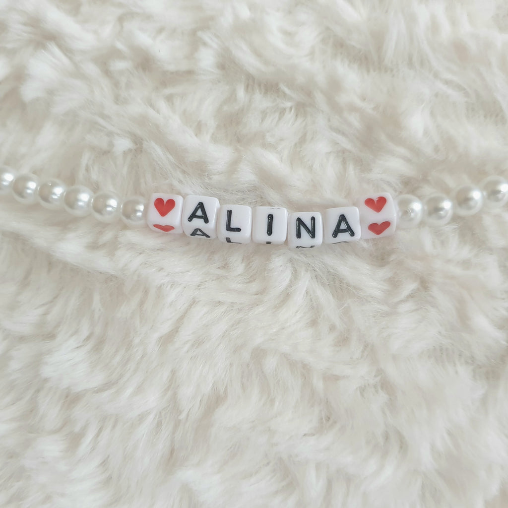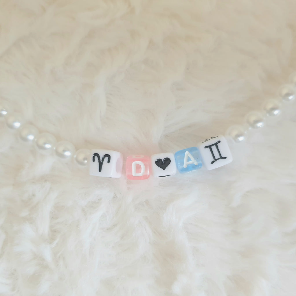 Personalisierte Halskette/Choker aus Kunstperlen mit 2 Herzen oder 2 Sternzeichen und Wunschname oder Wunschwort.