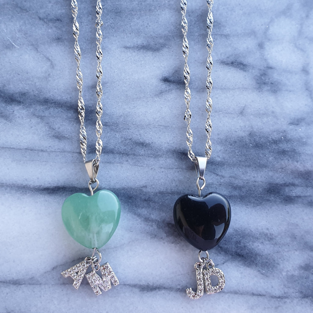 Naturstein Heilstein Edelstahlkette mit Herz und 2 Buchstaben