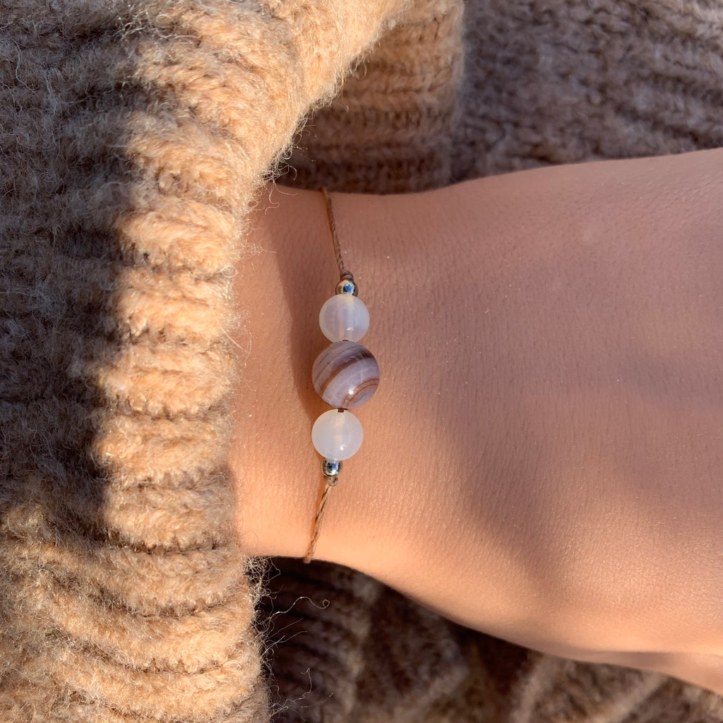 Das Armband ist aus Makrameegarn mit Botswana Achat und Weisser Achat Naturstein Perlen (6mm und 8mm). Die Abstandsperlen (3mm) sind aus Edelstahl oder bei goldfarben aus 14k gold filled.
